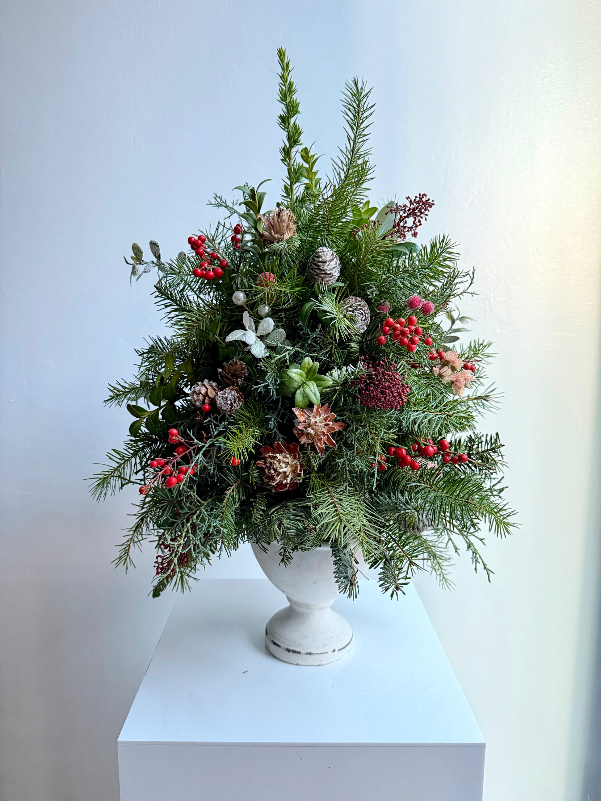 Our Evergreen Christmas Tree Arrangement is what we call a modern day hack for the classic fresh holiday tree in small spaces problem. Designed with fresh, highly fragrant seasonal evergreens in a white birch pot, and decorated with fairy lights and a festive, modern touch, this tabletop tree adds instant modern Christmas Tree charm to any space - especially small spaces! Ideal for those who don't want to be without a Christmas Tree this year! Also fabulous as festive decor for offices, gifting, holiday tables.